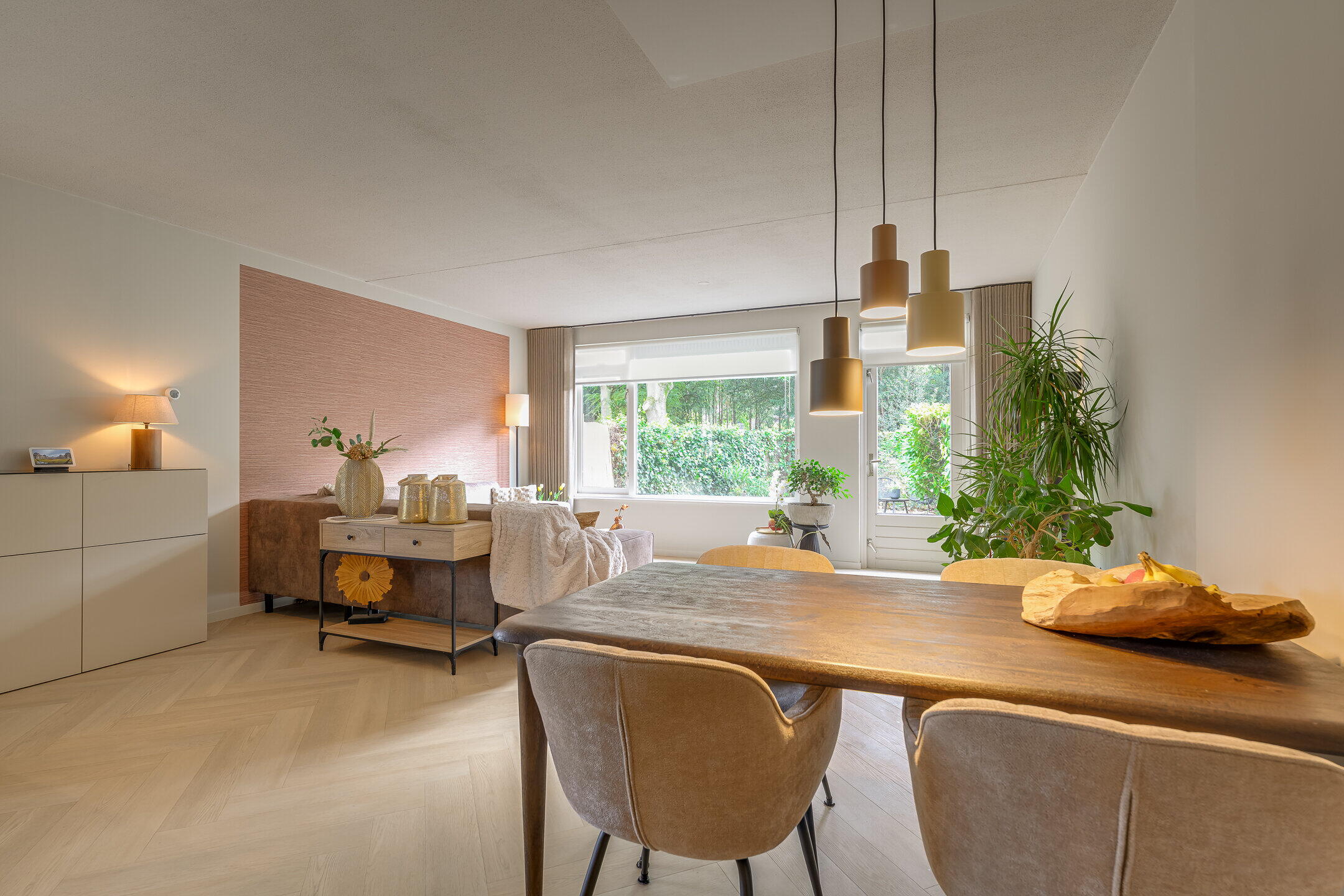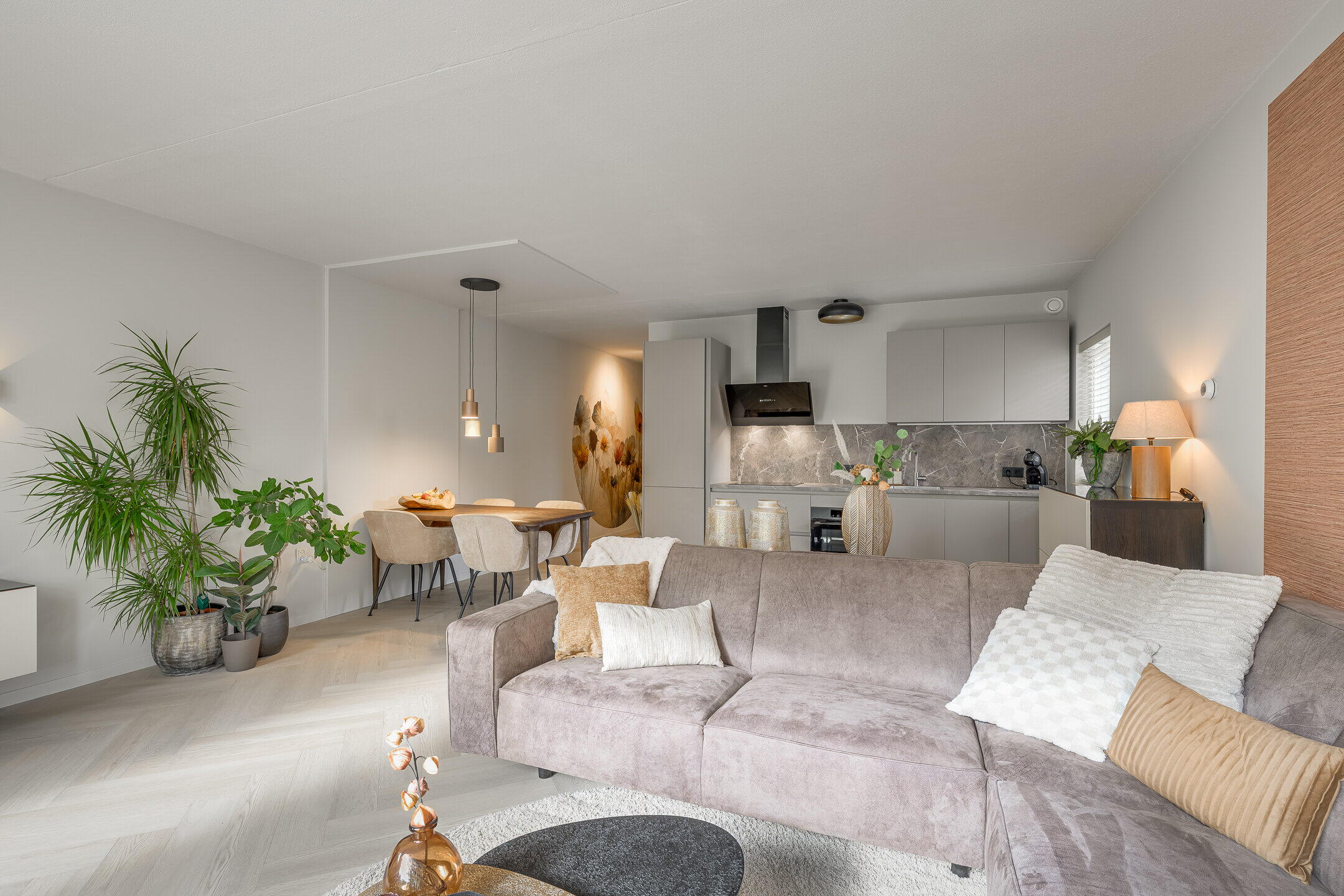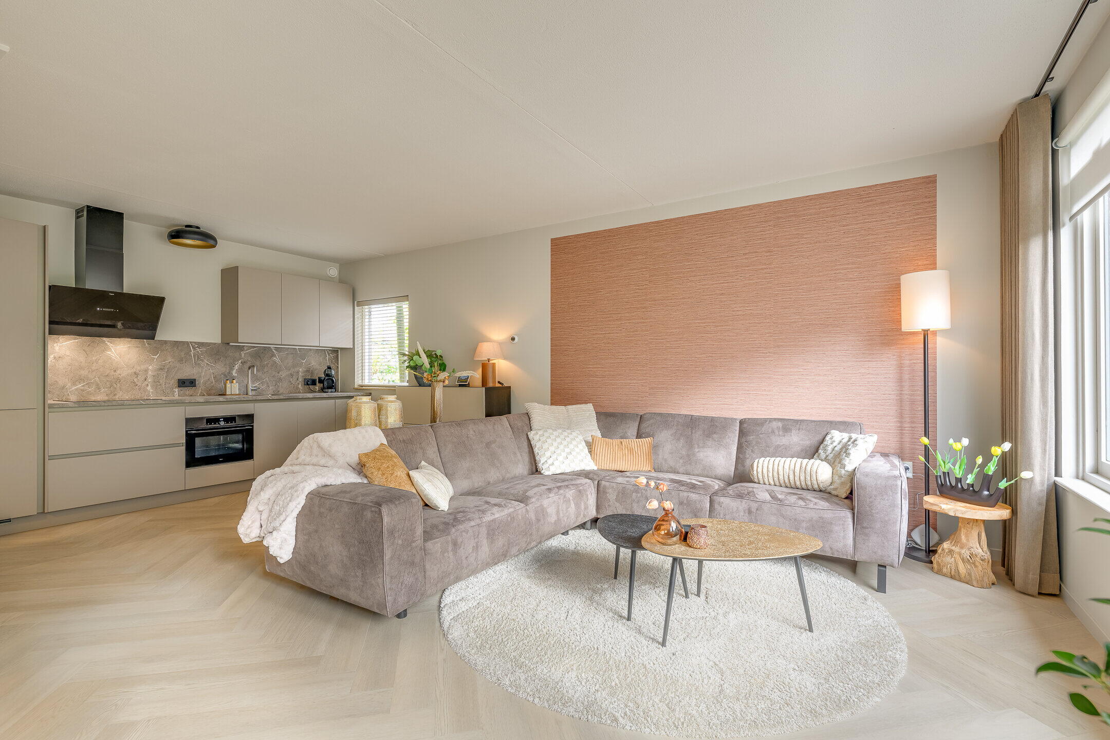 De open keuken, eveneens vernieuwd in 2025, sluit naadloos aan op de woonkamer en is uitgevoerd in een moderne stijl. De keuken is voorzien van diverse inbouwapparatuur zoals een combi-oven, inductiekookplaat, koel-vriescombinatie en vaatwasser. De woonkamer is licht en ruimtelijk ingedeeld, waardoor er een prettige verbinding met de tuin ontstaat.