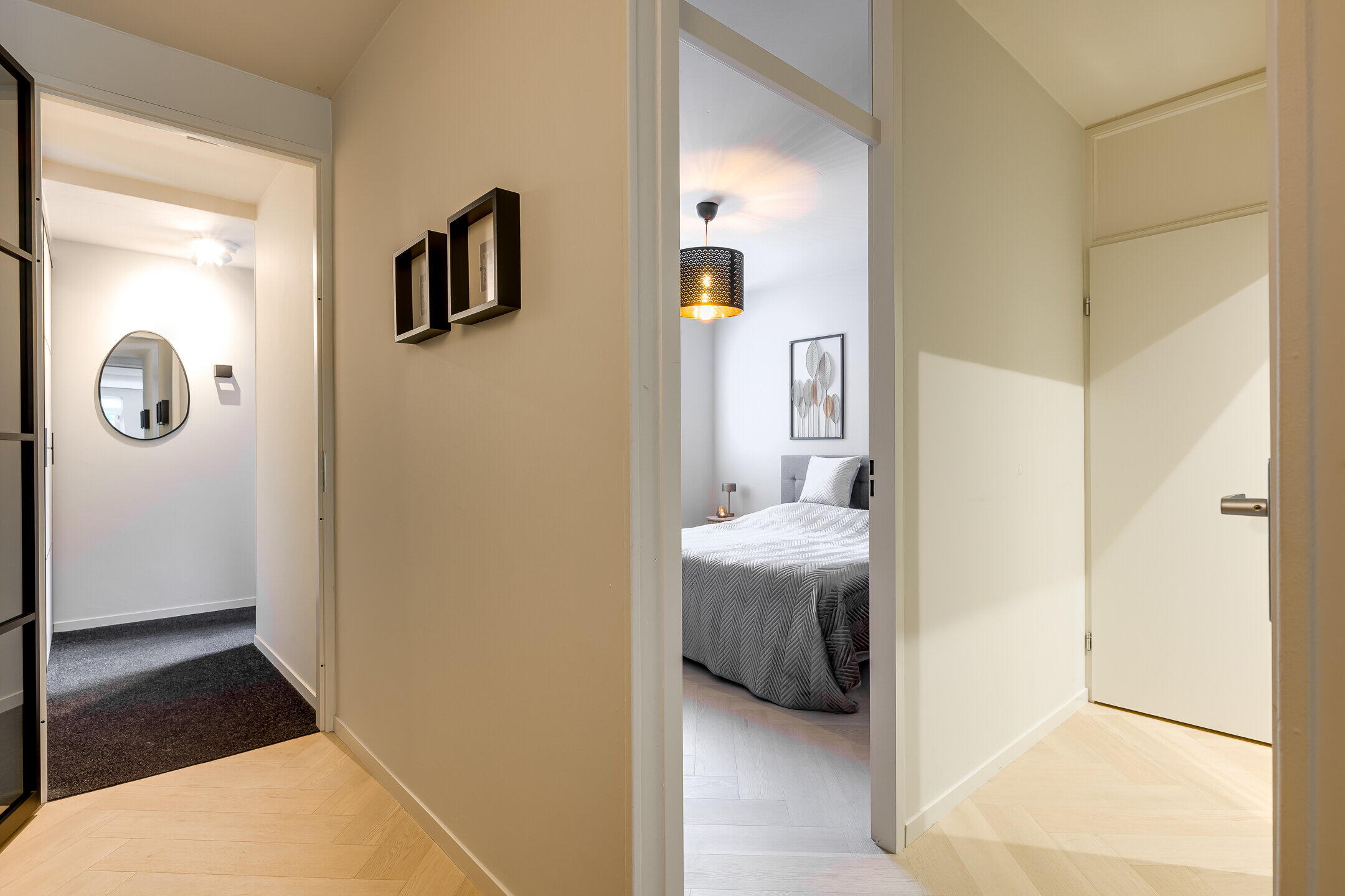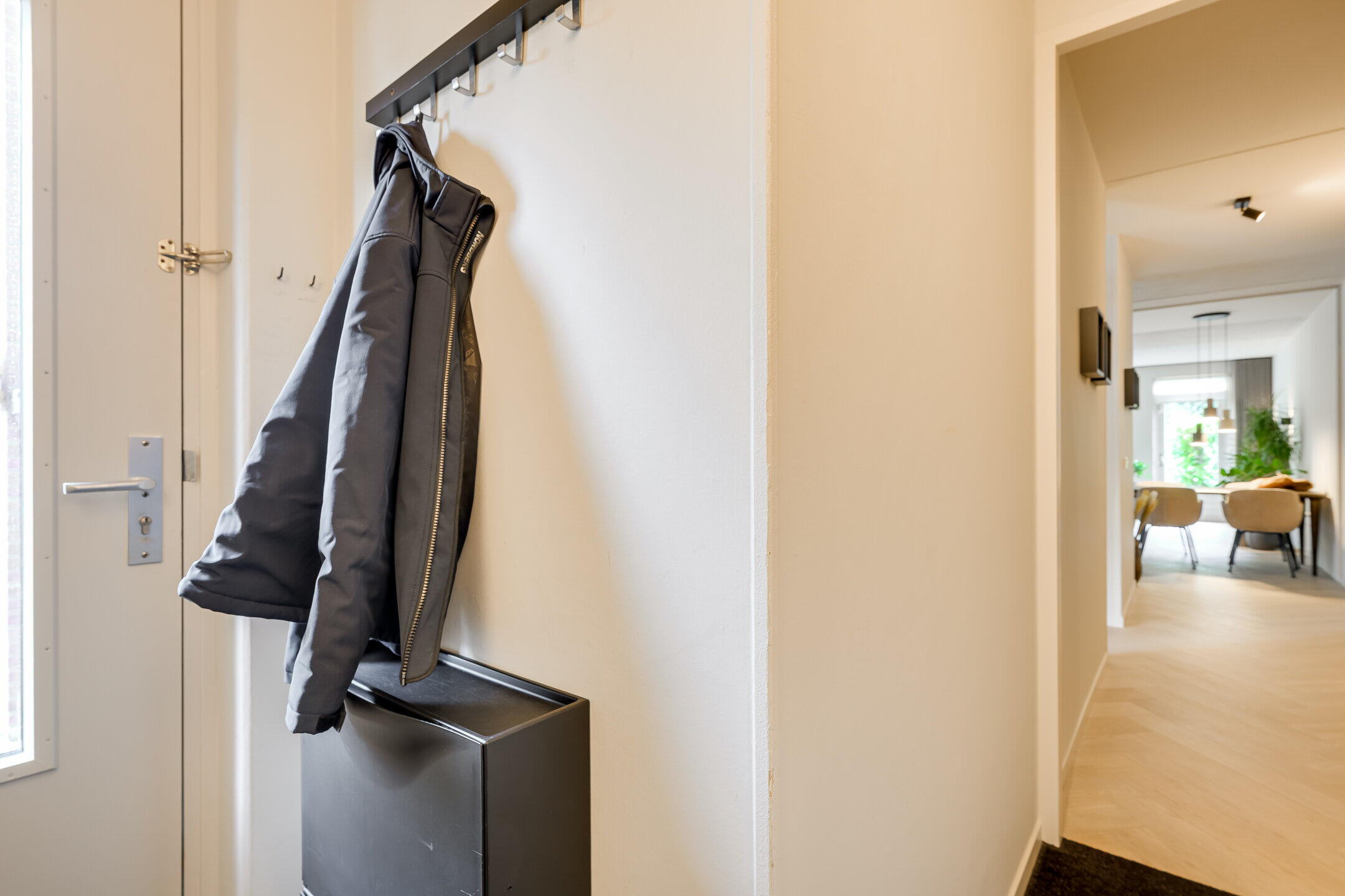 Via de goed verzorgde voortuin bereik je de entree van de woning. Vanuit de hal kom je in de gang die overloopt in de woonkamer. Aan de linkerkant van de gang bevinden zich de slaapkamer, de badkamer, het toilet en een aparte wasruimte. De slaapkamer is ruim van formaat en de moderne badkamer is in 2025 volledig vernieuwd en strak afgewerkt met een inloopdouche en een wastafel met meubel.